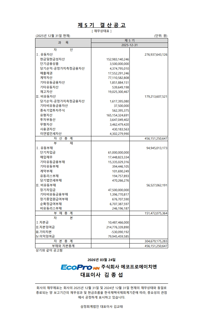 [공고] 에코프로에이치엔 제5기 결산공고 2026.03.24 다운로드.zip 에코프로에이치엔_제5기_결산_공고_별도.jpg (260.8 KB)에코프로에이치엔_제5기_결산_공고_연결.jpg (263.2 KB) 목록보기